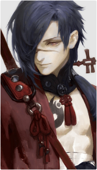 - Widoczny ekwipunek: Wakizashi przy lewej nodze. Katana z białą rękojeścią w czerwonej pochwie przy pasie od lewej strony, katana przy lędźwi w czarnej pochwie.