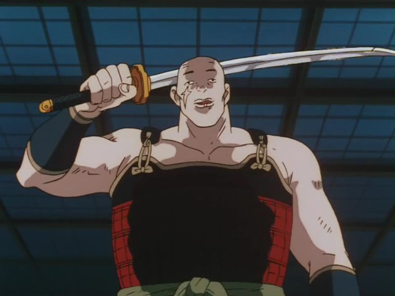 Widoczny ekwipunek: Wakizashi przy lewej nodze. Katana z białą rękojeścią w czerwonej pochwie przy pasie od lewej strony, katana przy lędźwi w czarnej pochwie.